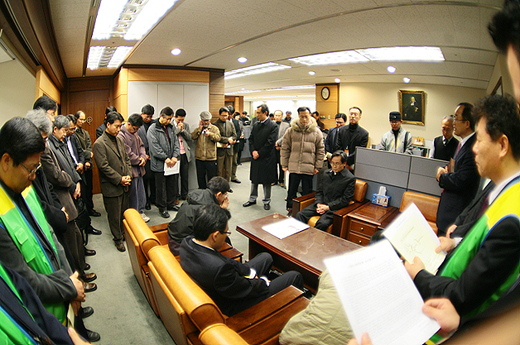 | ▲제2차 전국감리교목회자대회를 마친 실무진들이 총회에 방문해 전감목의 입장을 담은 서한을 총회 관계자에게 전달했다 |