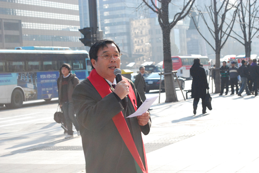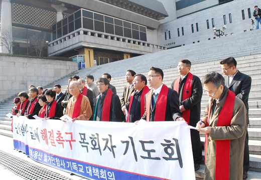 26일 세종문화회관 앞에서 용산참사 문제 해결을 촉구하는 목회자 기도회가 열렸다. 이번이 네번째 집회. NCCK 정의평화의원회 정상복 위원장이 설교를 전했으며 참석한 목회자들은 용산참사에 침묵하고 있는 정부를 규탄했다.