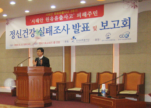| ▲ 서해안 태안 유출 사고 당시 피해지역을 방문해 봉사활동을 한 한국교회 성도들이 ‘서해안 원유유출사고’ 피해주민 정신건강 실태조사 발표 및 보고회에 참석했다 ⓒ베리타스 |