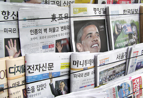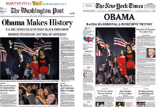 미국 첫 흑인대통령이 당선됨에 따라 버락오바마 진영은 물론 전 세계가 들떠있다. 전세계 언론들이 주목하고 있는 가운데, 미국의 언론들은 물론 국내 언론들도 오바마 당선소식을 6일 1면에 보도했다.
