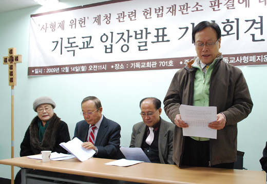 사형제 위헌제청과 관련한 헌법재판소의 판결을 앞둔 사폐연이 14일 기독교회관 7층 NCCK 예배실에서 기자회견을 가졌다. 문장식 목사는 인사말에서 “헌법의 정신은 생명을 존중하는 것”이라며 “기독교를 비롯해 여타 다른 종교들 역시 생명을 살리자는 것에 이견이 없다”고 했다.