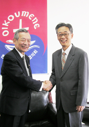 일본복음동맹 슈이지 나카지마 회장(왼쪽)과 NCCK 권오성 총무(오른쪽)가 악수를 나누고 있다.