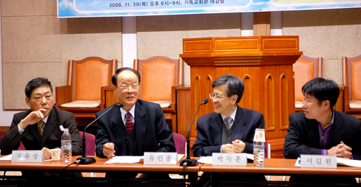 | ▲(왼쪽부터) 정유성 교수 , 유인종 교수, 박득훈 목사, 서길원 교사가 발제자, 토론자로 나섰다 ⓒ 오유진 기자 |