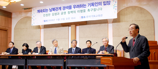 21일 서울 종로구 연지동 한국기독교회관에서 권오성 목사(NCCK 총무), 김명혁 목사(한국복음주의협의회 대표), 최희범 목사(한기총 총무) 등을 포함, 1백명의 기독인들이 기자회견을 열고, 조건부 대북정책을 추진하는 정부에 그 정책의 변화를 촉구하는 성명서를 발표했다.