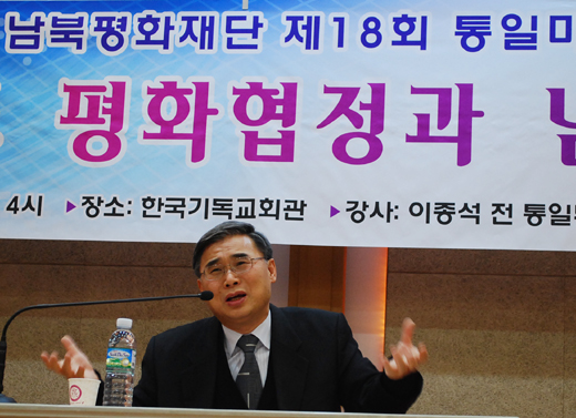 11일 오후 4시 한국기독교회관 2층 강당에서 제 18회 통일마당이 열렸다. 남북평화재단(이사장 박형규 목사)이 주최하는 이날 포럼에는 이종석 전 통일부 장관이 강연자로 초청됐다. 이 전 통일부 장관은 '한반도 평화협정과 남북관계'를 주제로 강연했다.