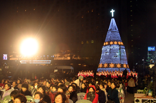 서울광장 서편에 세워진 크리스마스 성탄트리가 1일 오후5시 점등됐다. 한국기독교총연합회(엄신형 대표회장) 주최로 열린 점등식에는 한기총 엄신형 대표회장, 한국기독교교회협의회 권오성 총무, 오세훈 서울시장, 조용기 여의도순복음교회 원로목사 등 1000여명이 참석했다. 이날 점등된 크리스마스트리는 내년 1월 4일까지 매일 오후 5시부터 다음날 새벽 2시까지 불을 밝힌다.