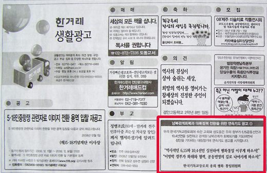 | ▲빨간 네모 부분이 기장 광고 ⓒ한겨레 12월 2일자 종이신문 |