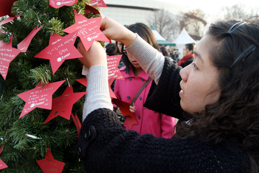 | ▲희망트리에 카드를 다는 시민의 모습 ⓒ굿네이버스 |