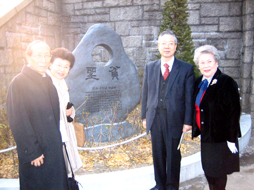 | ▲ 송창근 목사 기념비 앞에서 찍은 기념사진. 왼쪽부터 경건과 신학연구소 주재용 소장, 부이사장 윤영랑 권사, 서울성남교회 배태덕 담임목사, 책을 집필한 송우혜 집사. |