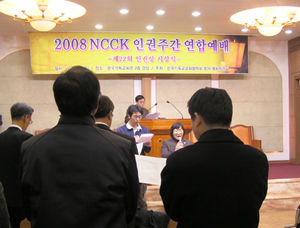 앞서 열린 예배에는 정상복 목사(NCCK 정의·평화위원회, 순례자교회)가 ‘회칠한 무덤’이란 주제로 우리사회에서 인권 문제가 소외시 당하는 부분을 지적했으며, 이어 지난 8월 수감됐다가 1백일 만에 출소한 한상렬 목사(전주고백교회)가 강단에 올라 인사말을 전했다.