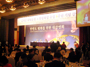 김 전 대통령은 16일 오후 여의도 63빌딩에서 열린 노벨평화상 수상 8주년 기념 ‘한반도 평화 대강연회’연설에서 이같이 말했다. 그는 “정부가 국내 각계각층과 대화하는 상설기구를 열어 국론의 통일과 공동협력에도 힘써야 한다”며 “이 대통령이 원한다면 함께 무릎을 맞대고 남북문제를 논의할 용의도 있다”고도 했다.