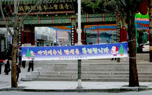 22일 오전 서울특별시 종로구 견지동 조계사 총무원엔 오는 25일 성탄절을 축하하는 플랭카드가 내걸려 있다. 얼마전 까지만 해도 정부의 종교차별 정책을 거세게 비판했던 불교 때문에 종교간 불편한 관계가 연출되기도 했으나 성탄절을 며칠 앞둔 지금 조계종은 평화롭기만 하다.
