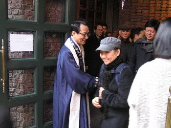 | ▲경동교회 성탄예배 후, 박종화 목사가 성도들과 인사하고 있다 ⓒ김진한 기자 |