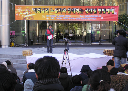 한편, 교회도 성당도 아닌 거리에서 열린 성탄예배도 있었다. 경기 한파로 더욱 소외되어 가고 있는 비정규직 노동자들. 그들과 함께하는 성탄예배가 오후 3시 서울 태평로 기독교대한감리회 본부 회관 앞에서 열린 것이다.